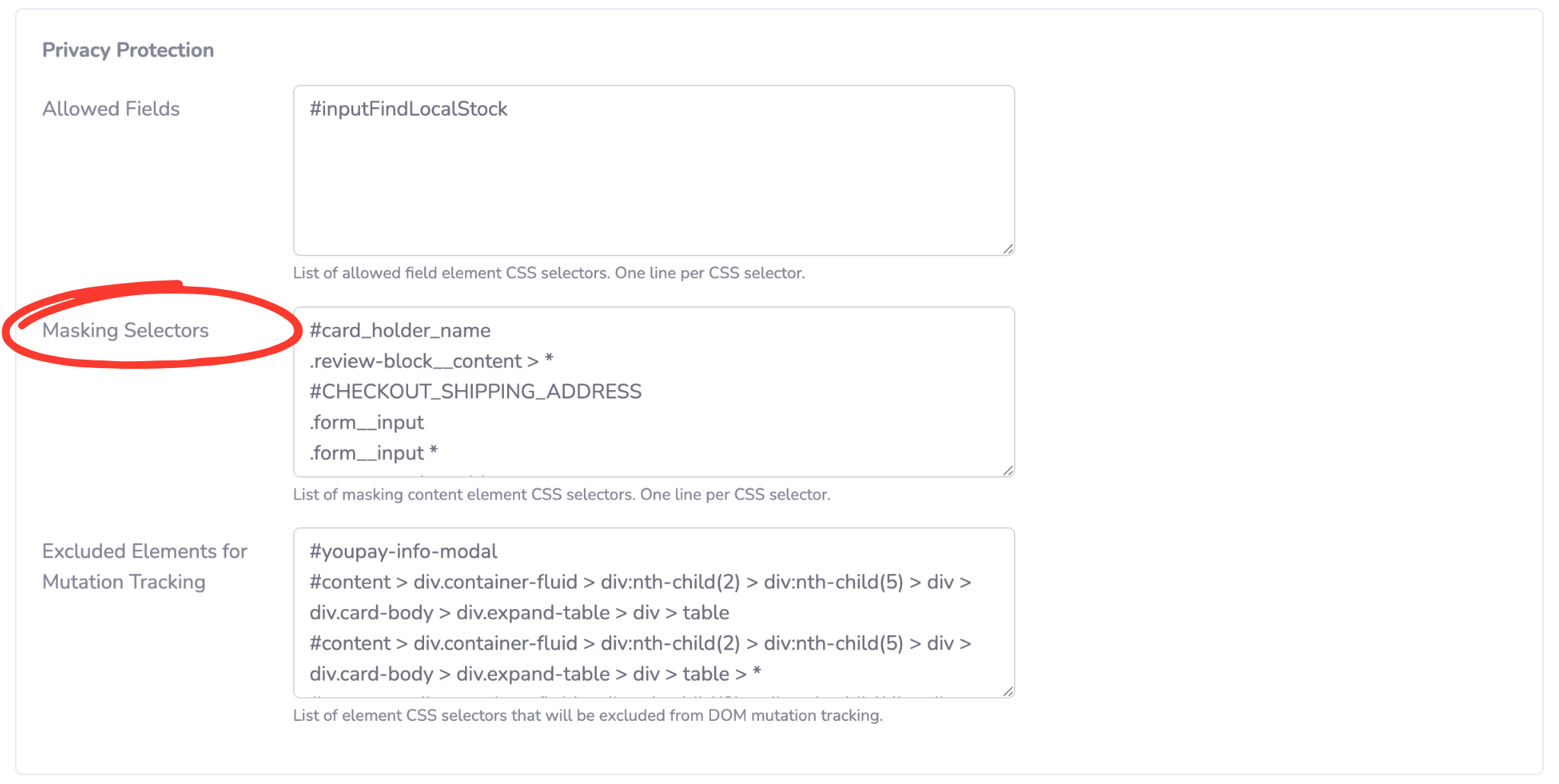 - Input your custom masking rules for each element you want to mask. This can be any CSS attribute, class, ID, element or selector