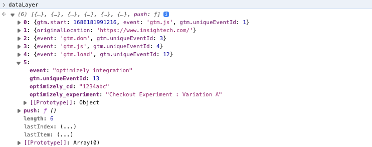 You can find the Event Name, EventID, as well as the Optimizely Experiment in the dataLayer object once the code is implemented as the following screenshot shows.