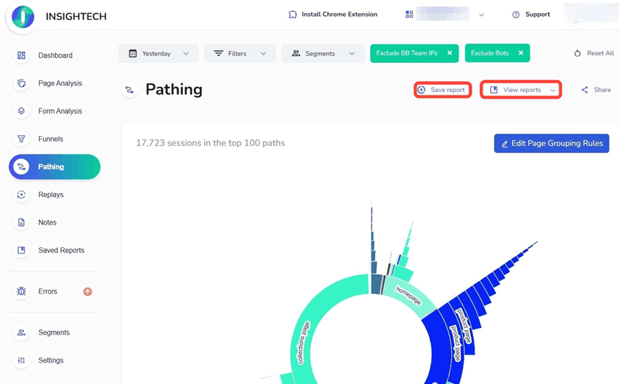 Once you’ve configured a pathing report with the date range, filters, segments, and grouping rules, click Save report and give your report a meaningful name. Your saved report will then appear in the View reports menu on the same page for quick access by your team.