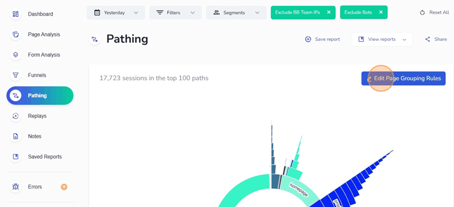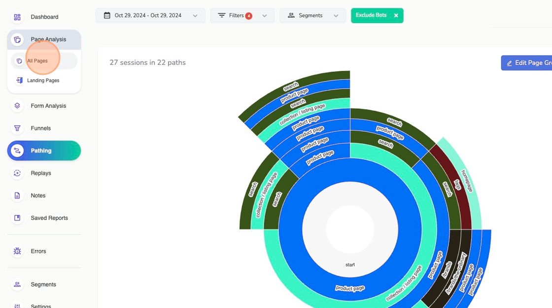 Instead of looking at single pages, or a single set of funnel flow steps, pathing is an open/ explorative view of what users do when they deviate from a key flow, and how they enter, navigate, and exit your website.