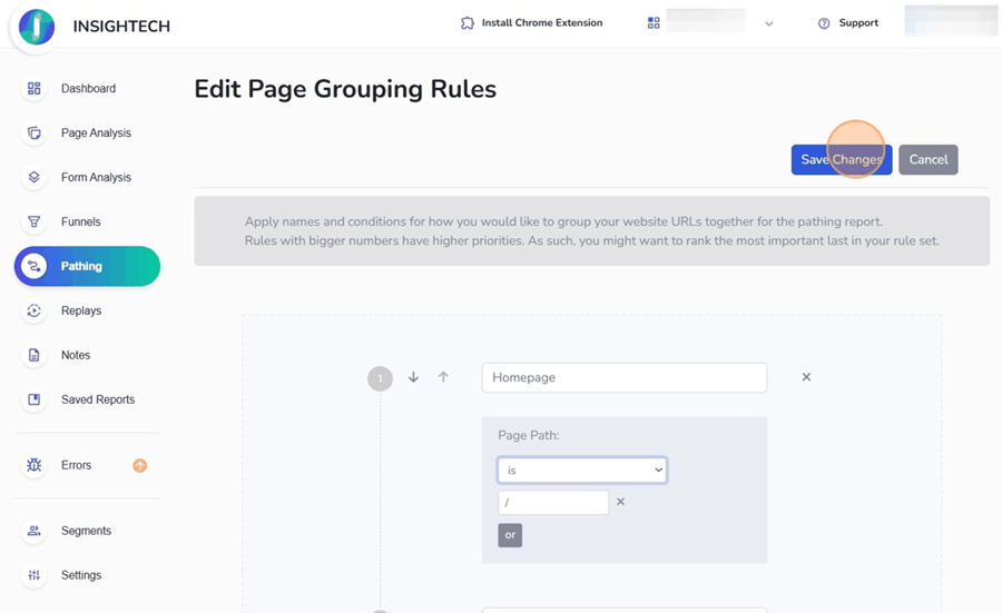 In the Pathing report, click Edit Page Grouping Rules . This opens the Edit Page Grouping Rules page.