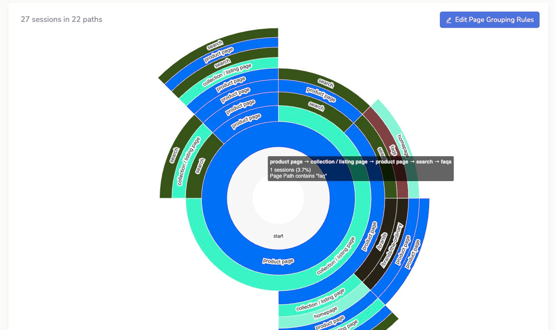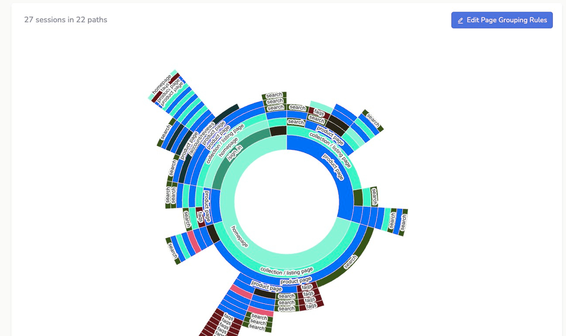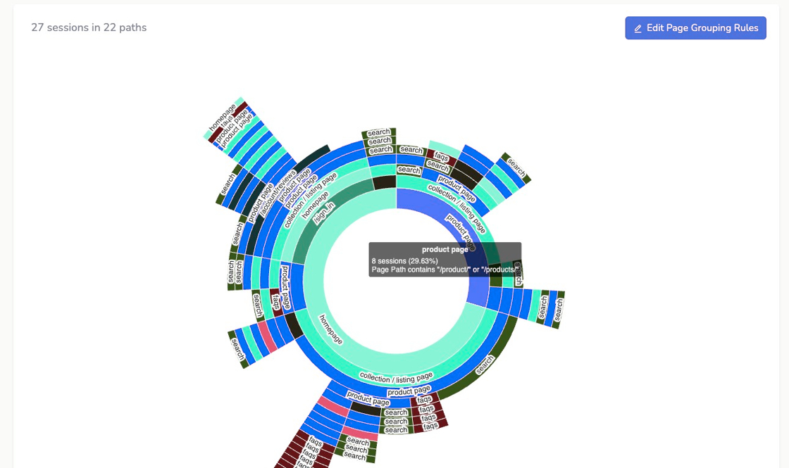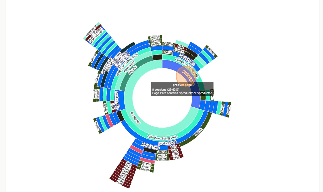 In this example, we see that most sessions begin from the Homepage, whereas 29.6% of users begin their journey on the product page.