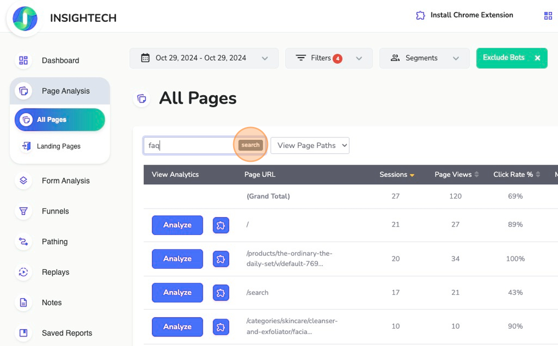 Click 'Page Analysis' --> All Pages (in left navigation) – To bring up the page listWe can also type in 'FAQ' into the page search, to bring up the FAQs page.