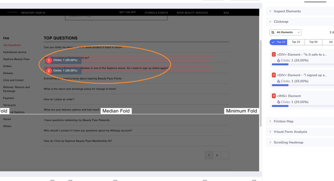Click 'Analyze' to Open the FAQ Clickmap – We can now look at what the highest clicked items are on the FAQ page to identify key content that these users are looking for. We can see from the clickmap that users who leave the Product Page are going to the FAQs to click on 'Is it safe to shop on Sephora.com.au', and 'I am a loyalty club member. Do I need to sign up again?'