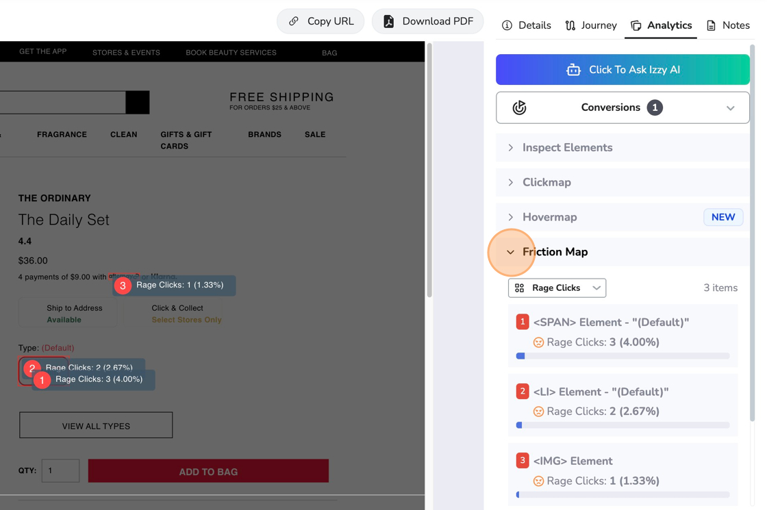 - Click the Friction map to overlay the rage clicks on top of the page content