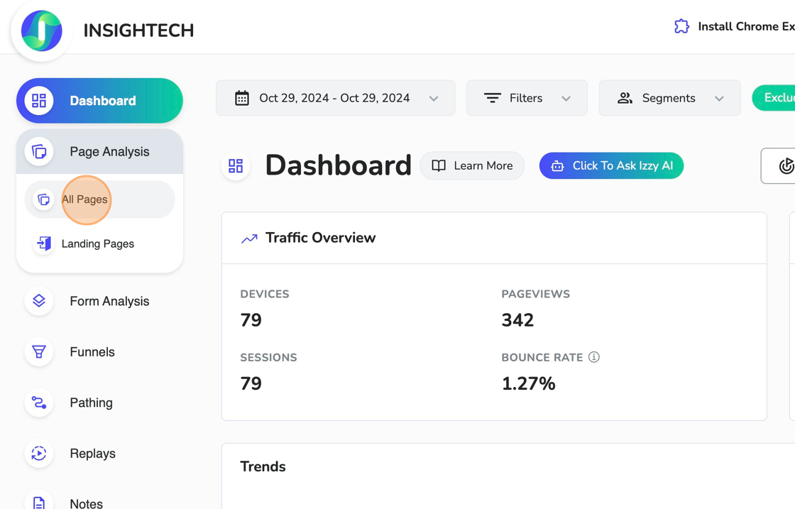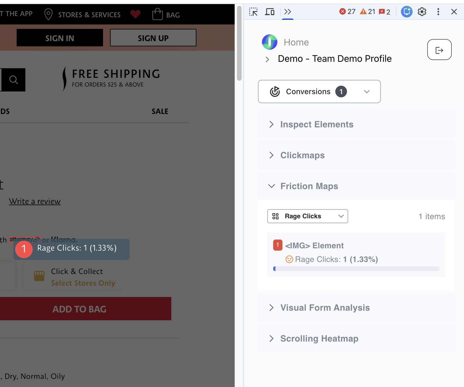 Alternatively you can Open the Chrome Extension on your live website, and click on Friction Maps to overlay the Rage Clicks on your live website.