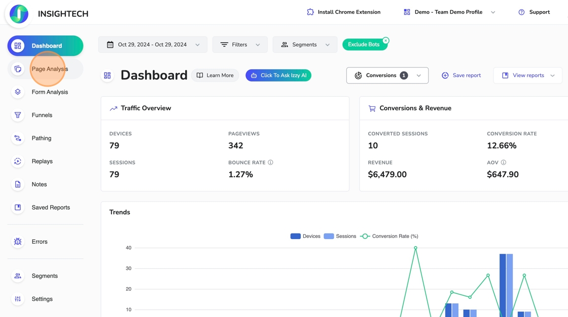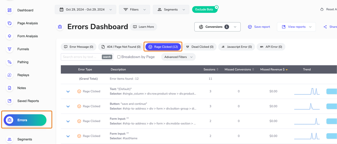 The Errors report in Insightech automatically detects errors including Rage clicks, and shows you where the most common issues are occurring, including which issues are causing the biggest impact to your website conversions.