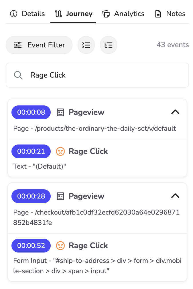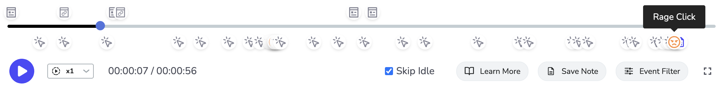 When clicking into the replay itself, you will also see these angry-faced icons on the replay timeline, showing you exactly where the rage click occurred.