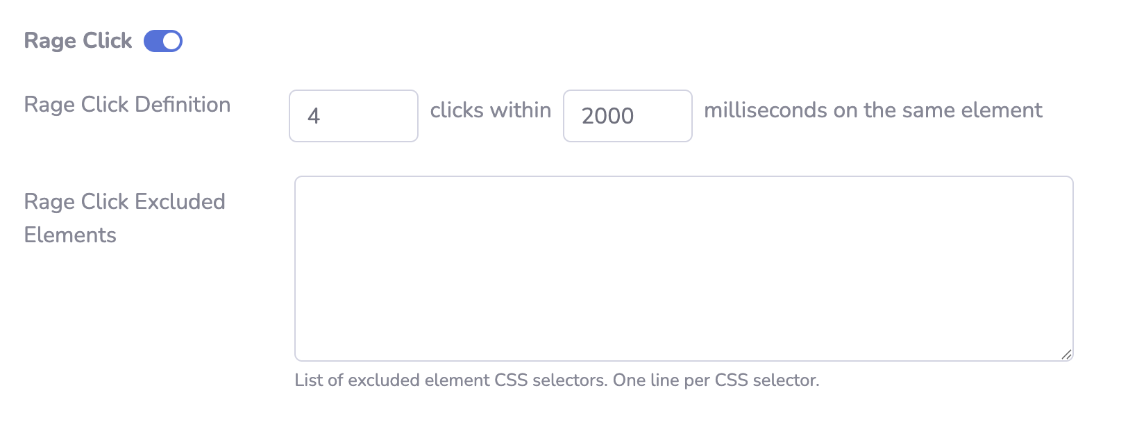 Rage Click Excluded Elements: This input field allows you to exclude specific elements from being tracked in your Rage Click reports. This could include elements like Product Carousels, Calculator Buttons, or arrow navigation icons.